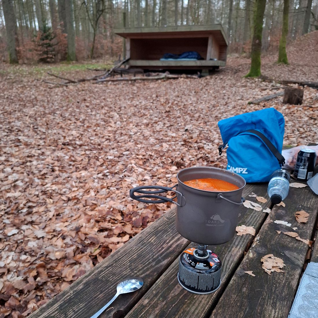 Jeg spiste suppe på shelterpladsen, men det blev hurtigt mørkt og koldt, så jeg kravlede tidligt i soveposen og så lidt serier på telefonen.